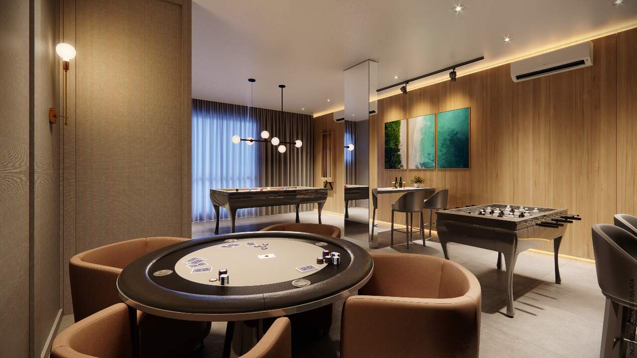 - Pé direito duplo no hall social, salão de festas, sala de jogos e brinquedoteca