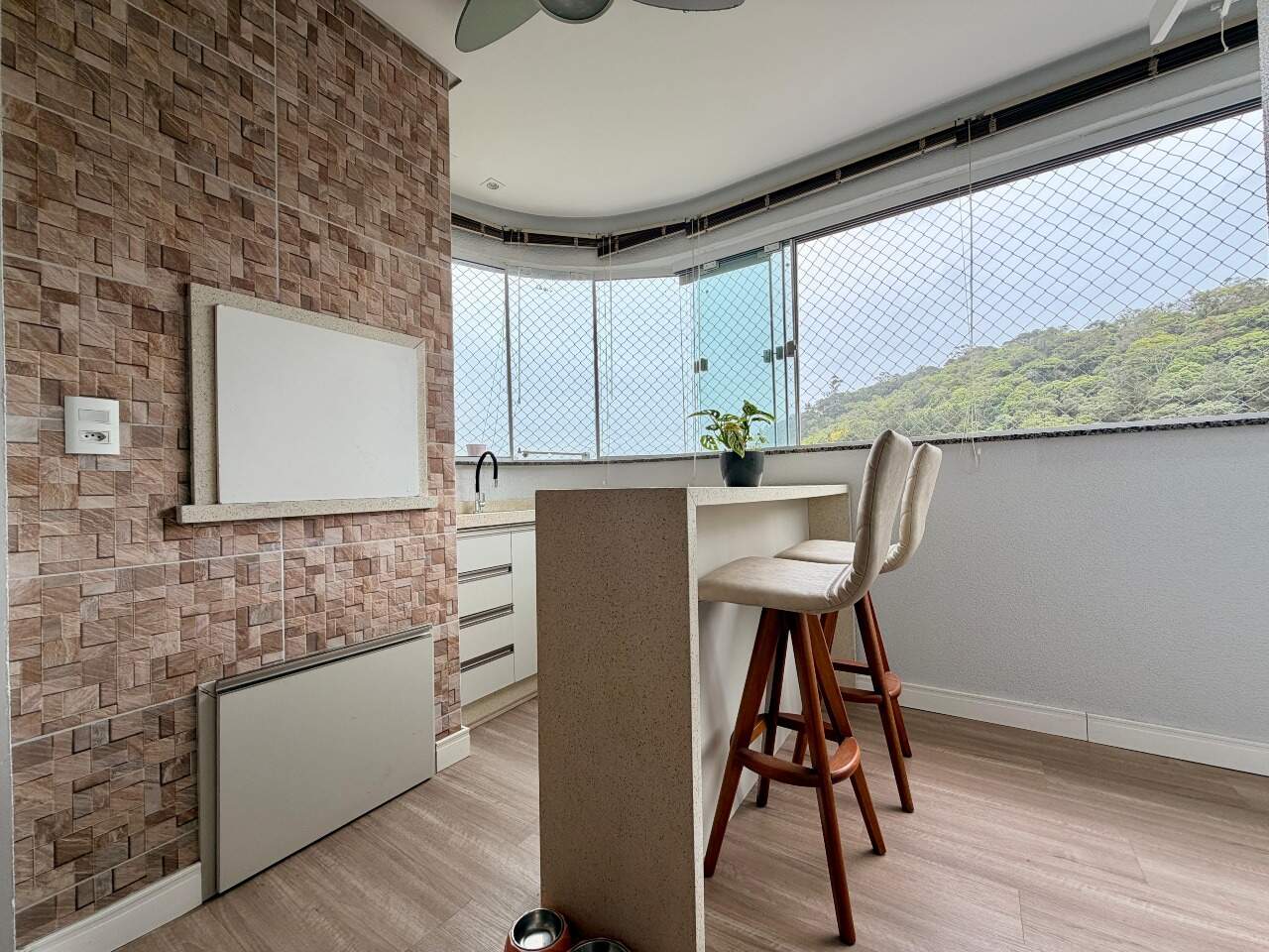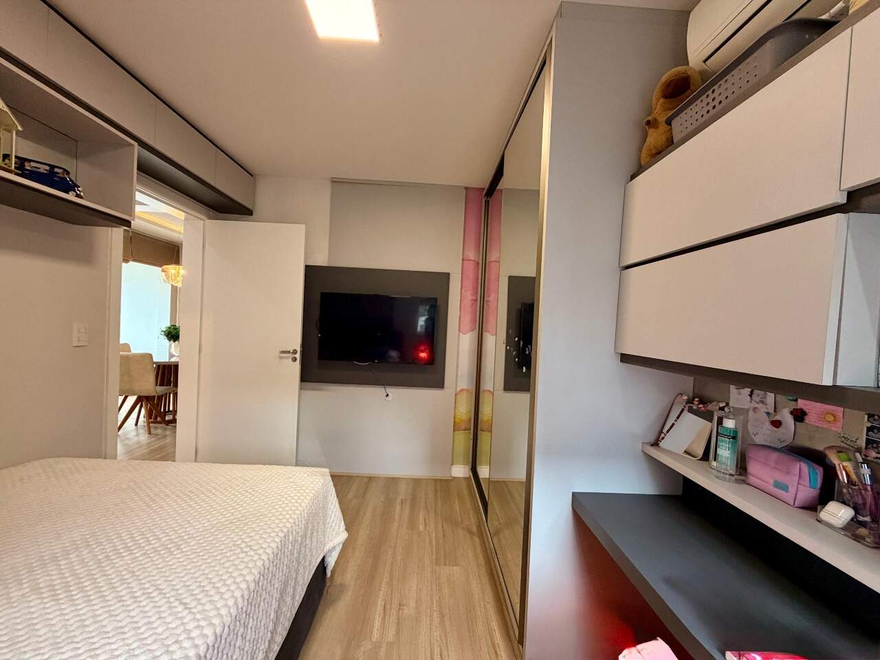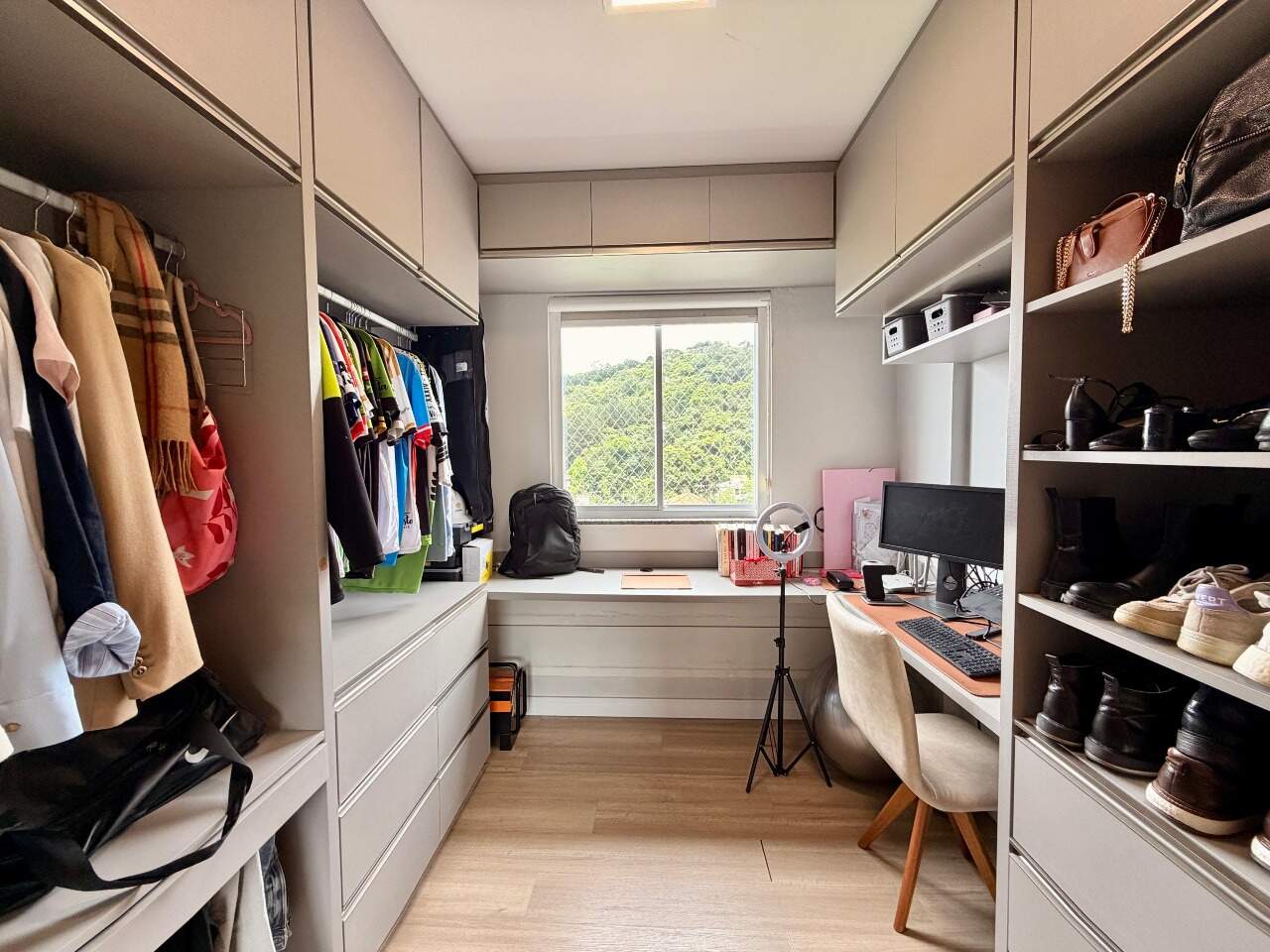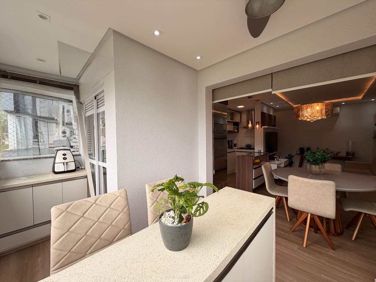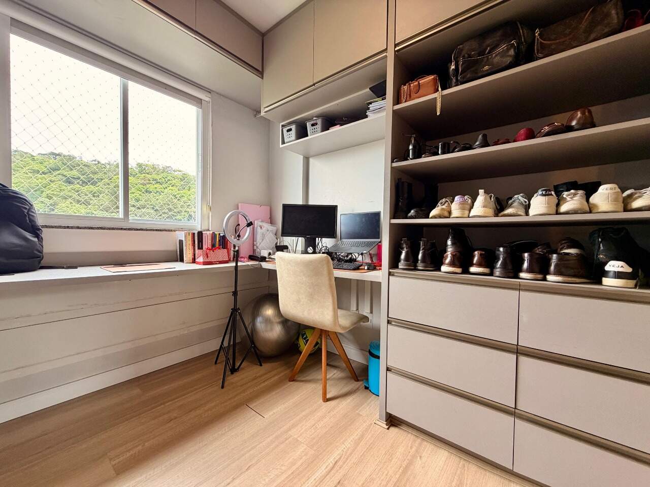 Possui 3 quartos, sendo 1 suíte. Atualmente, o segundo quarto sendo usado como closet e home office da suíte, 2 banheiros, sala, varanda gourmet com linda vista, área de serviço, closet, despensa, escritório, mobiliado e armários planejados.