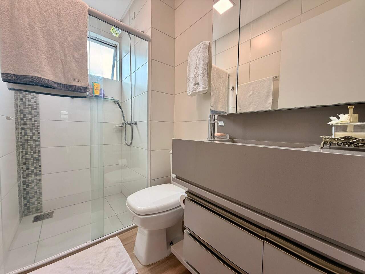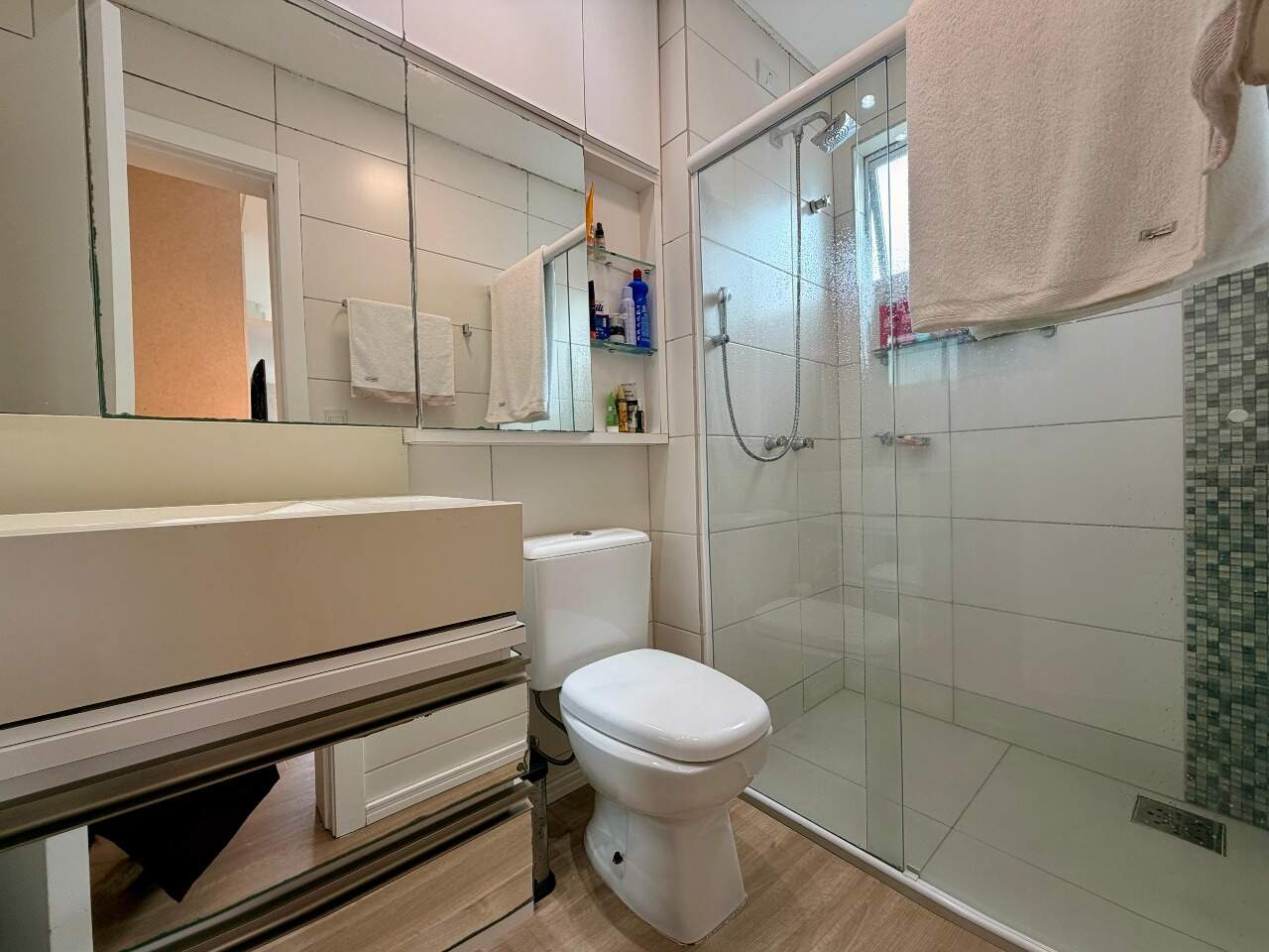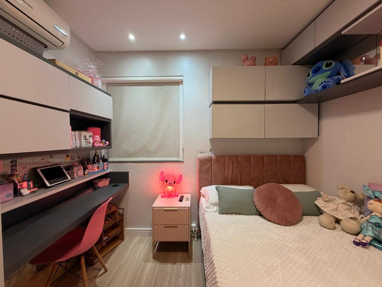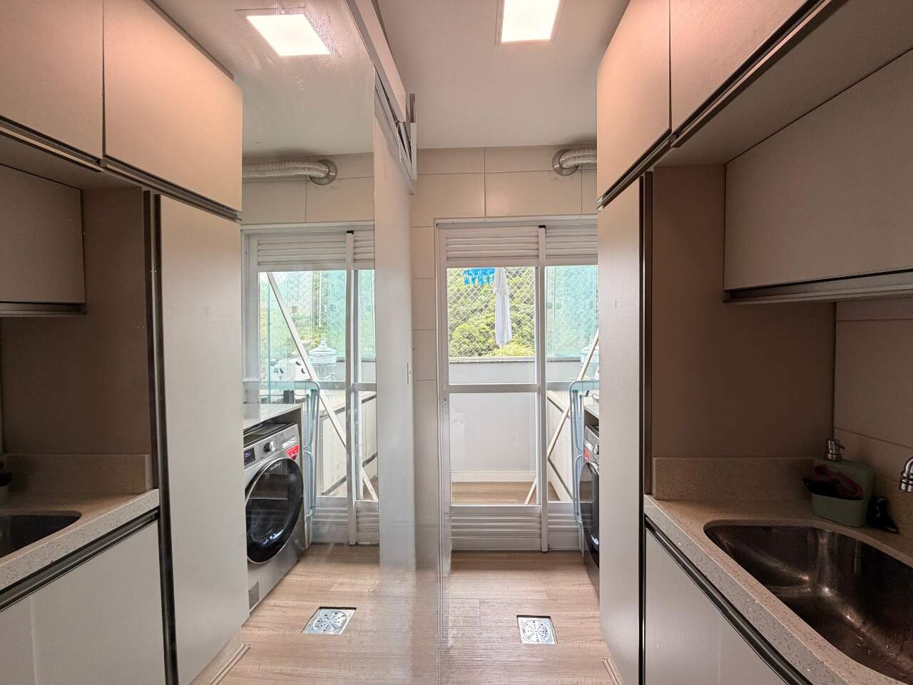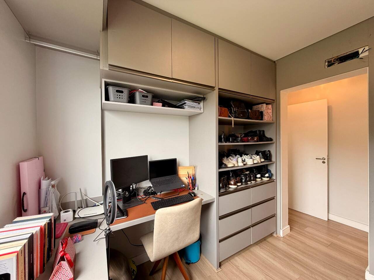 Possui 3 quartos, sendo 1 suíte. Atualmente, o segundo quarto sendo usado como closet e home office da suíte, 2 banheiros, sala, varanda gourmet com linda vista, área de serviço, closet, despensa, escritório, mobiliado e armários planejados.