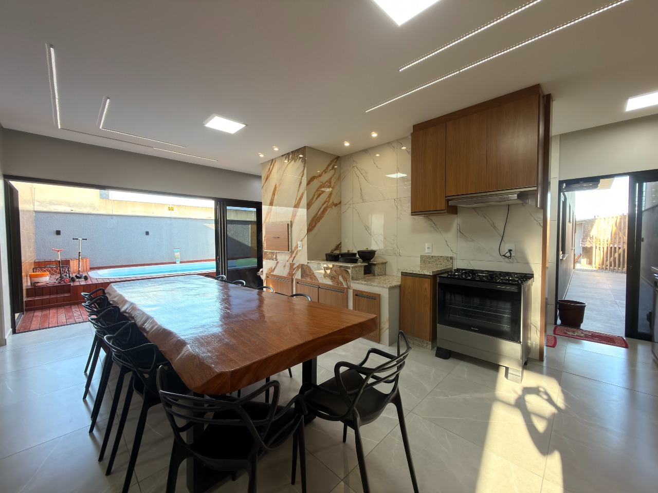 Na área social, os ambientes são amplos e integrados: sala de estar, sala de jantar e espaço gourmet com charmoso fogão a lenha. A casa ainda conta com lavabo, lavanderia e um generoso espaço nos fundos, ideal para momentos de lazer e convivência.