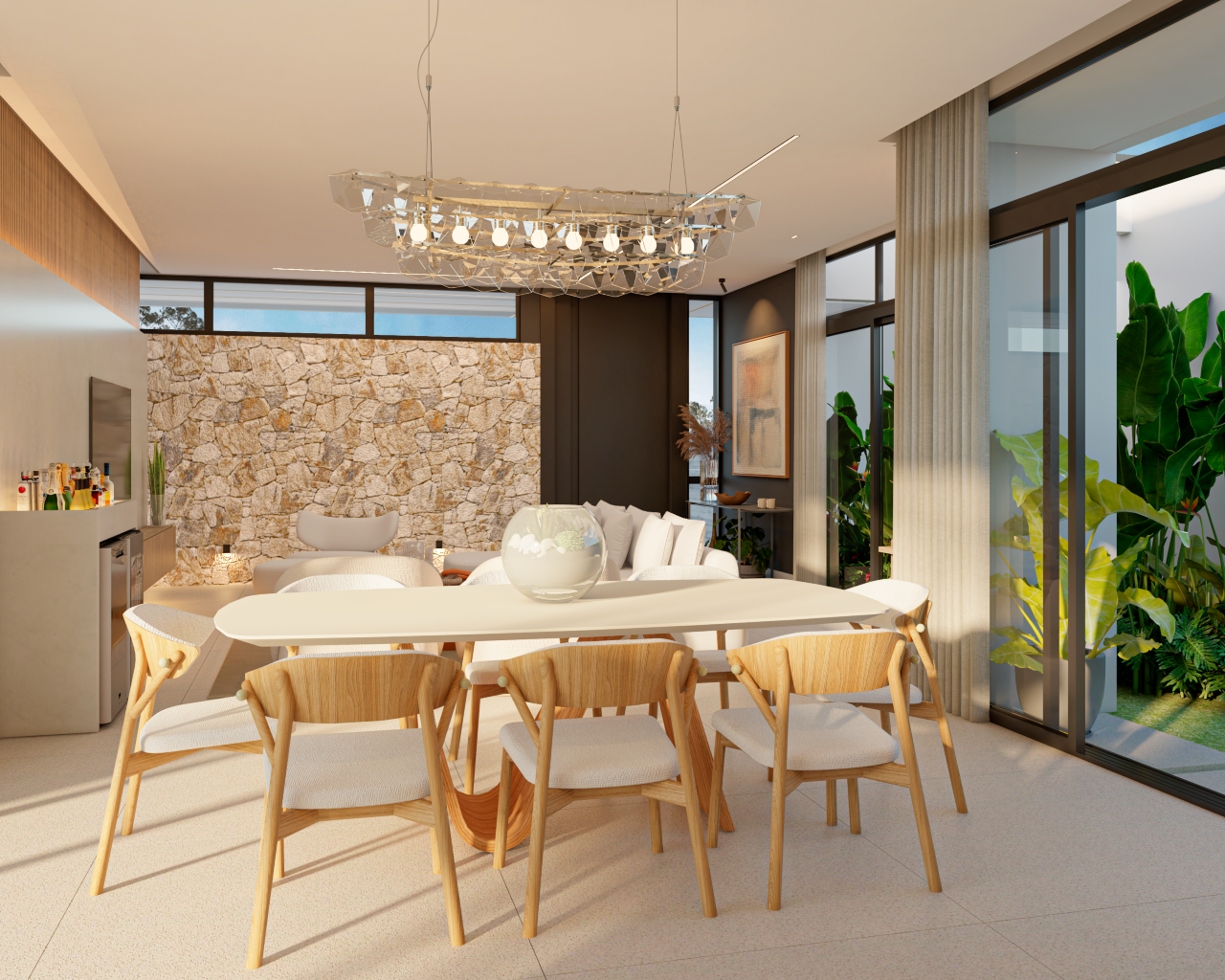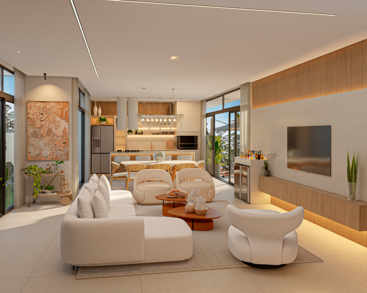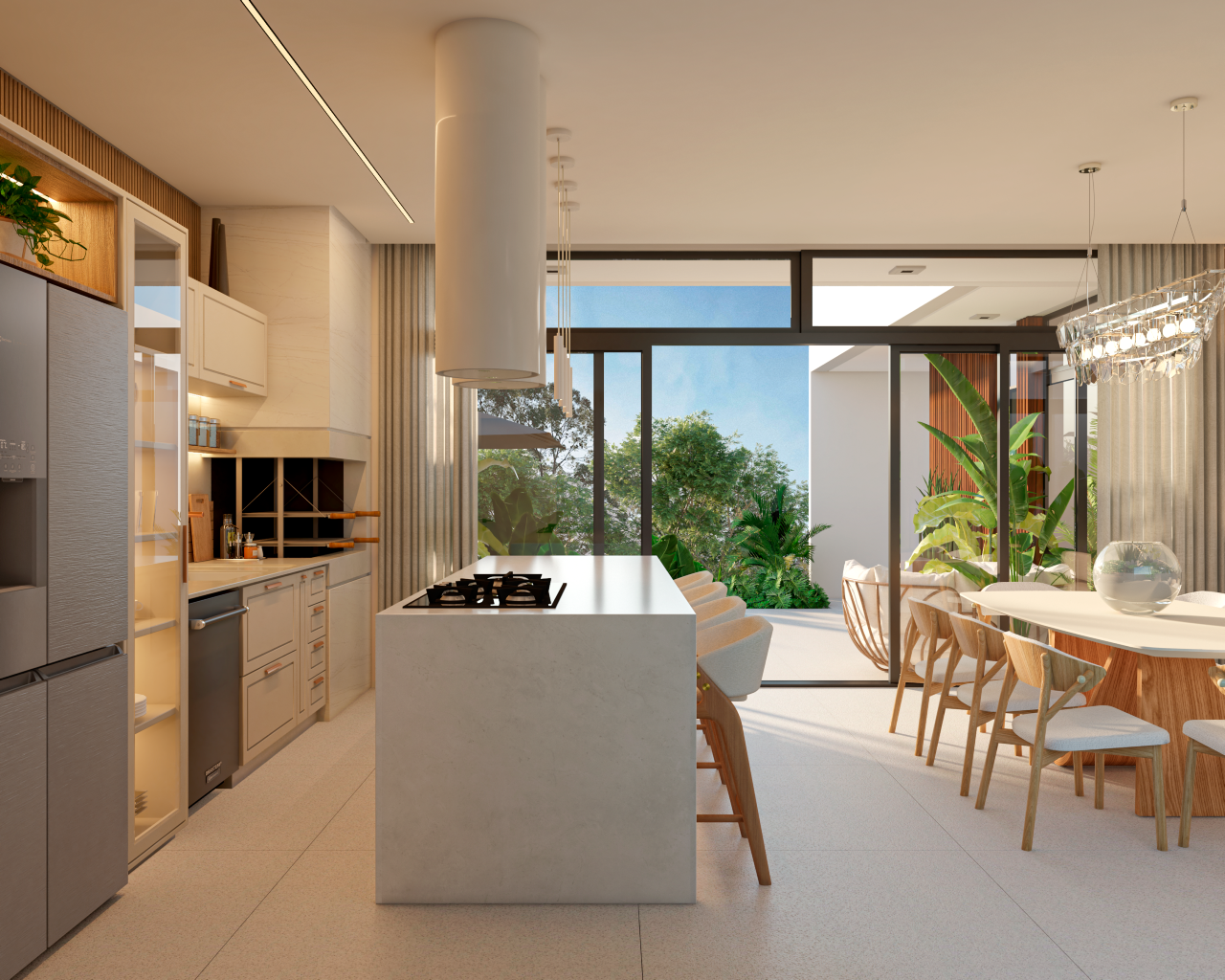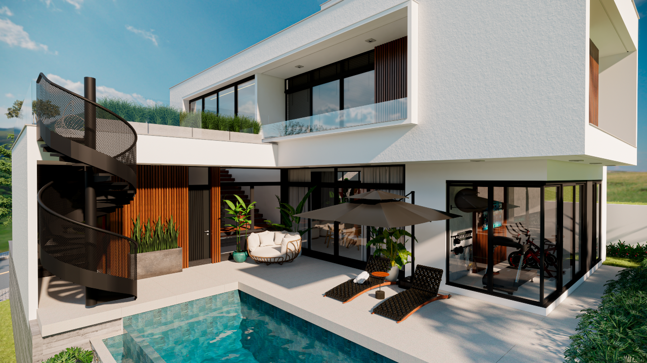 O térreo integra sala de estar, sala de jantar e cozinha em um layout moderno e fluido, com conexão direta ao rooftop e à área da piscina. A residência também dispõe de lavabo, área de serviço e academia privativa.