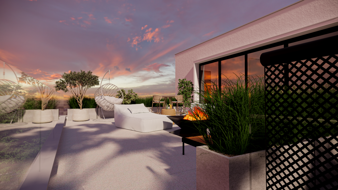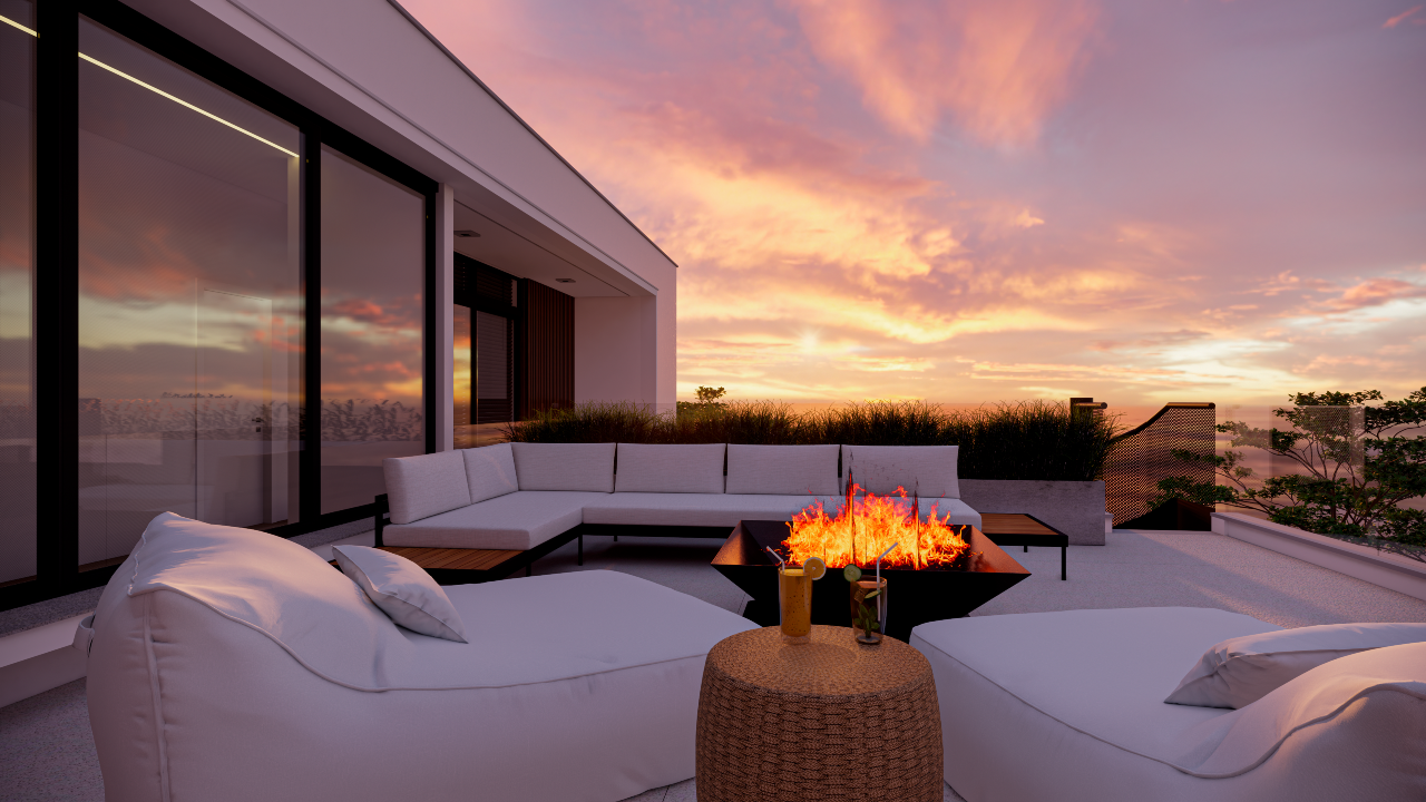 O rooftop com fireplace foi projetado como um espaço exclusivo de lazer e contemplação, ideal para receber convidados ou desfrutar de momentos de tranquilidade com total privacidade.