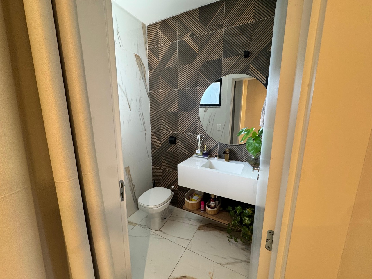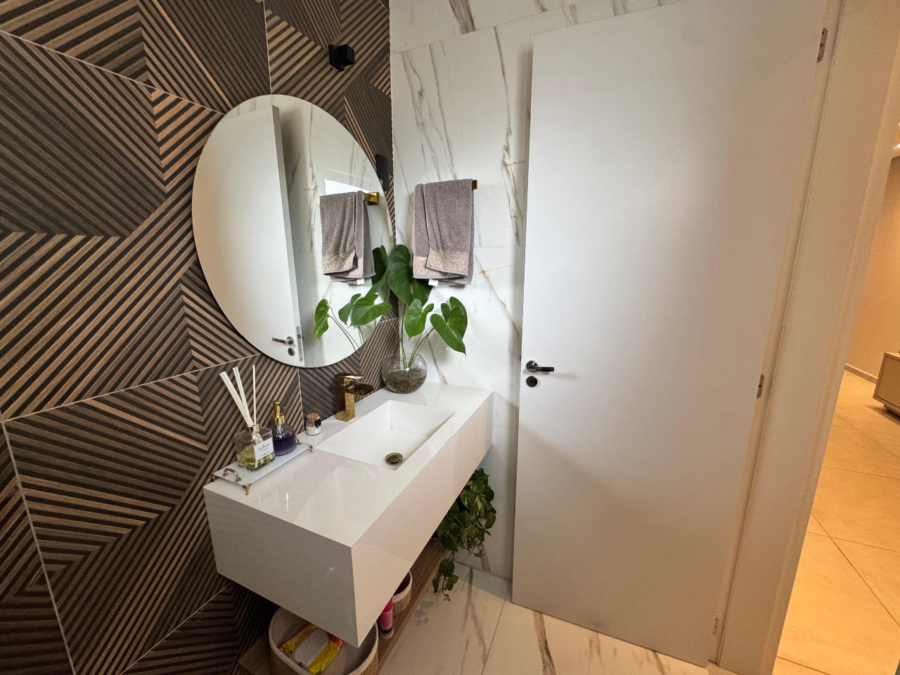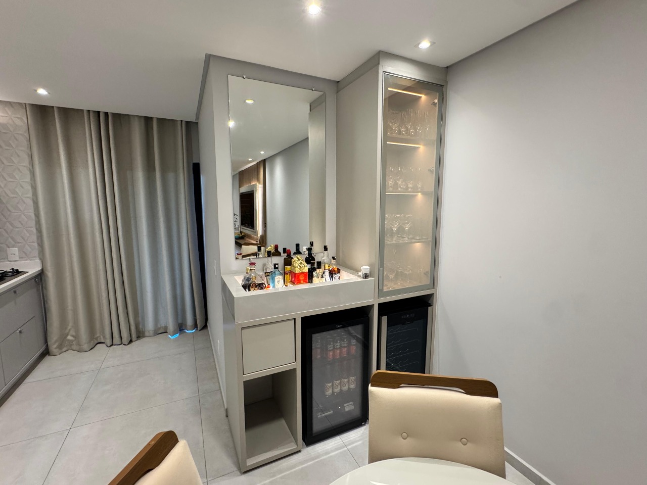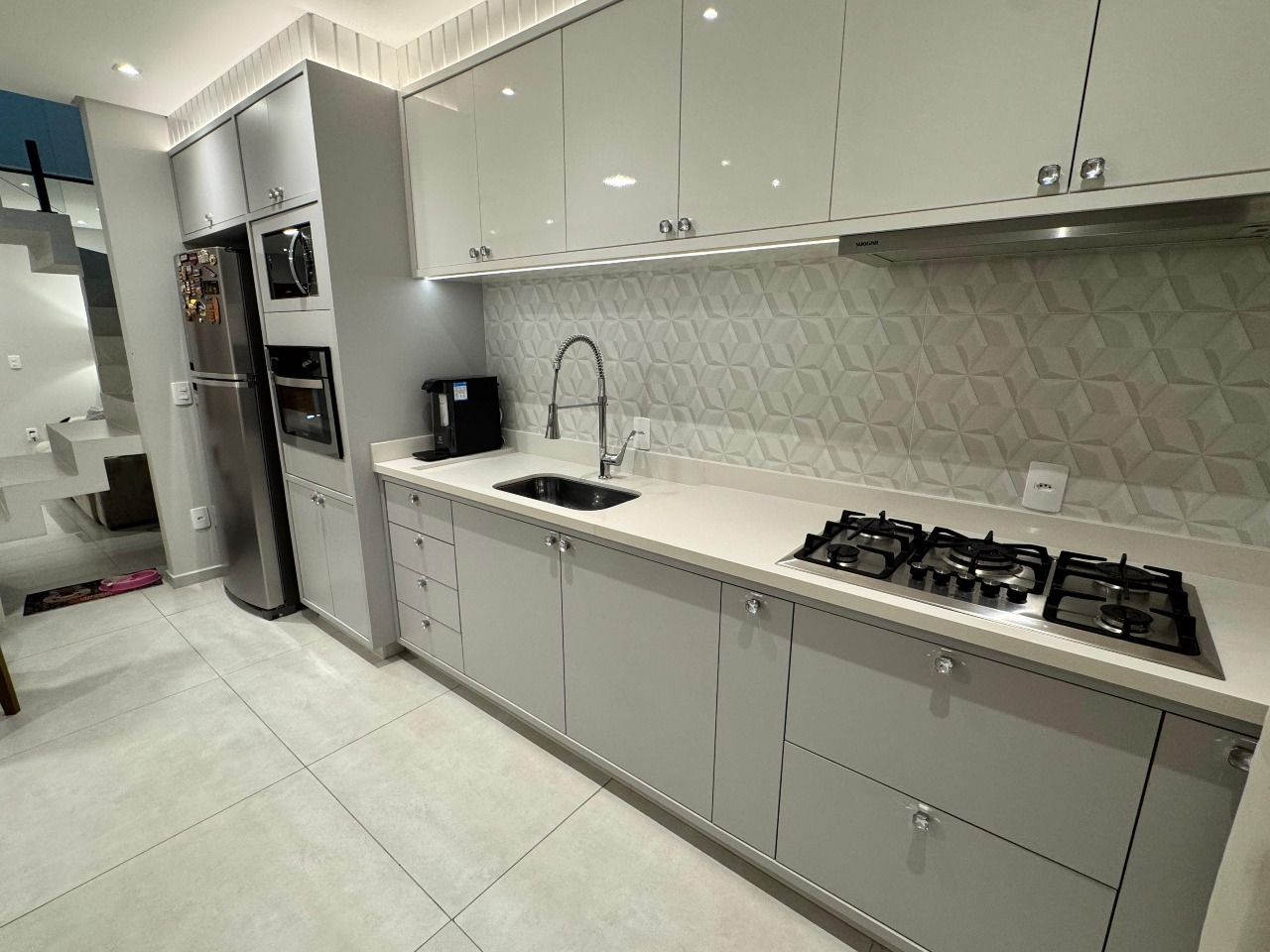 - Cozinha de cinema: Armários planejados em alto brilho e revestimento 3D;
